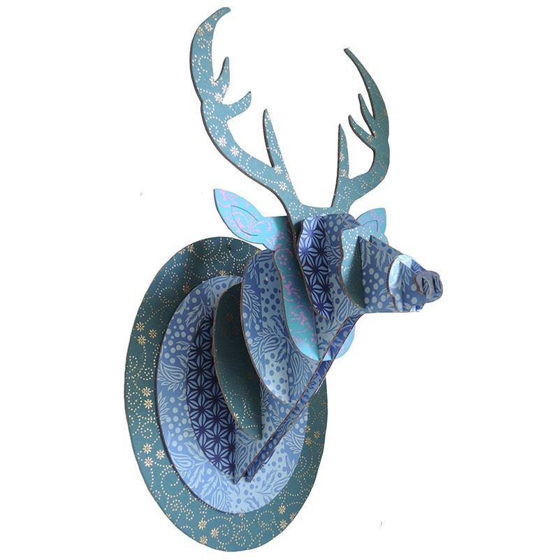 Trophée carton cerf bleu pailleté poétique et ludique, plein de fantaisie et de gaieté à accrocher dans les chambres des enfants, pour recréer l’univers magique de la vie en montagne. Ce trophée est en carton épais à assembler soi-même (d’une simplicité déconcertante puisque les 11 pièces s’emboîtent facilement sans collage ni accessoire) et livré dans une boite plate pour éviter toute pliure. Il est joliment décoré et pailleté pour certains et permet à peu de frais de créer une déco montagne éphémère et d’en changer au gré de vos envies. Une collection vache complète joyeusement ces trophées qui se renouvellent régulièrement. De très jolies créations pour des rêves d’enfants colorés plein de charme et d’humour.